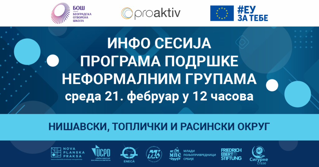 Onlajn info sesija organizacije Proaktiv koja pokriva Nišavski, Toplički i Rasinski okrug biće održana 21. februara od 12 sati. Zainteresovani treba da popune kratak formular, a link za prisustvo dobiće dan pre održavanja info sesije.